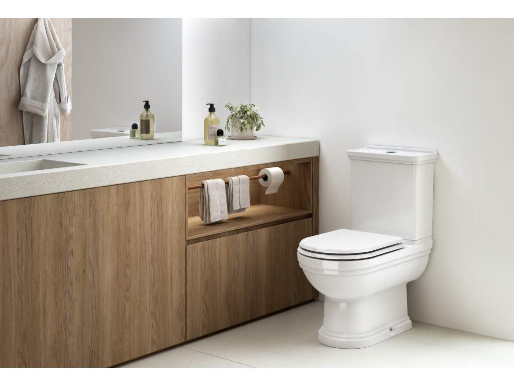 Close-coupled WC pack consisting of WC with dual outlet and fixing kit, bottom left inlet cistern, double push 6/3 litres mechanism and fixed walnut white seat.