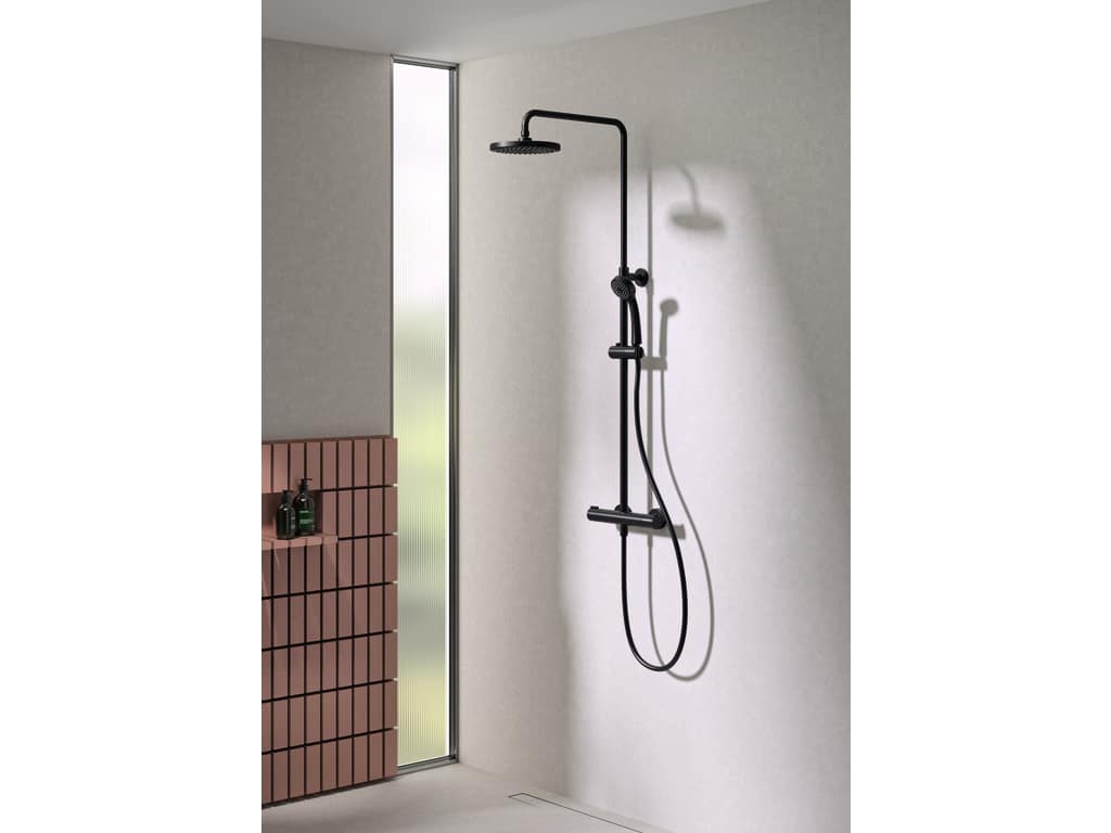 Columna de ducha. Grifería termostática. Barra de ducha extensible 49 cm . Equipo de ducha: Rociador de Ø 20 cm , Flexo de 150 cm , Ducha de mano 1 función y soporte para ducha de mano.
