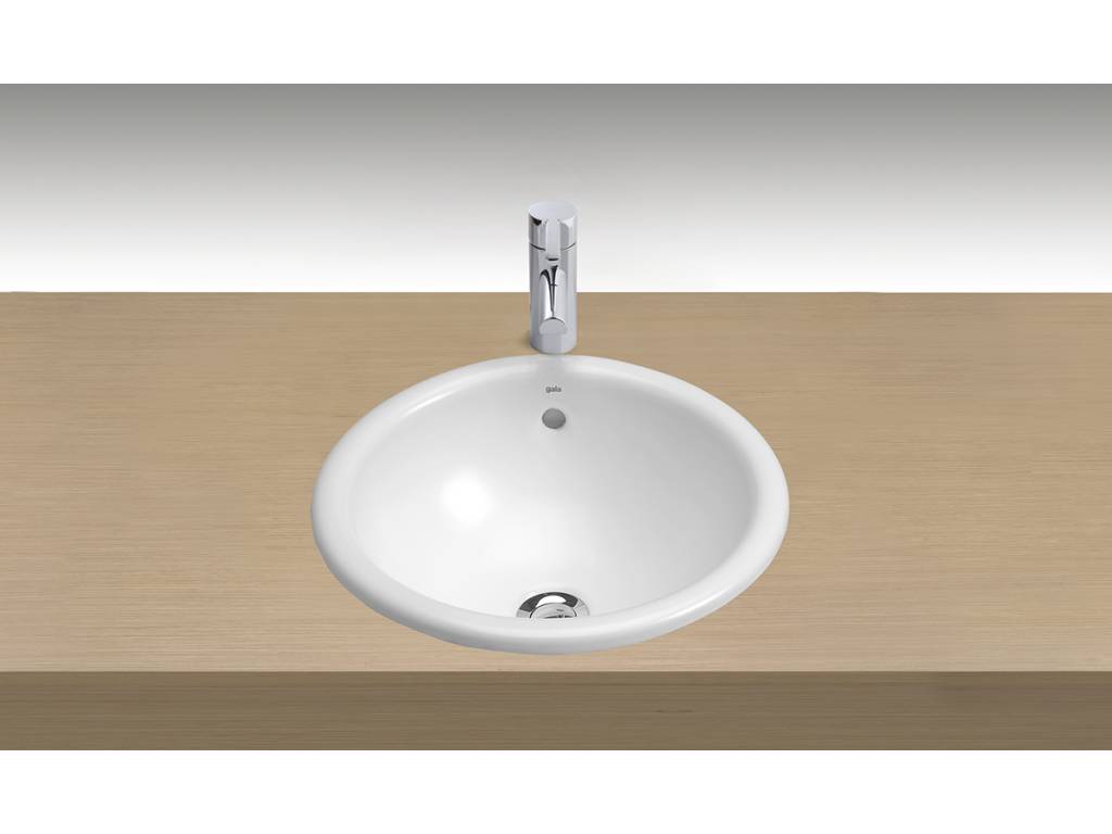 Lavabo Jara de Ø 39,5 cm. con rebosadero. Sin orificio de grifería. Posibilidad de instalación de encimera o semiempotrar. Plantilla de corte circular de Ø 37 cm para instalación de encimera o semiempotrar.