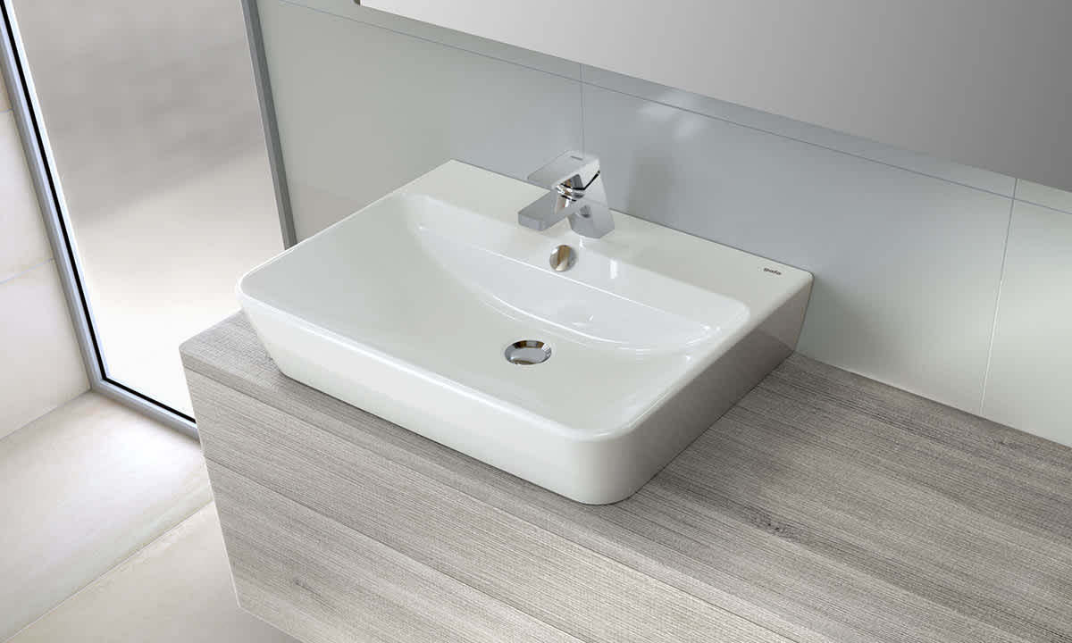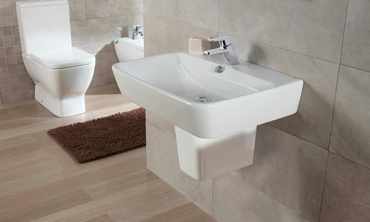 Lavabo Emma Square de 55 x 45 cm. con rebosadero y juego de fijación. Posibilidad de instalación con pedestal, semipedestal, mural o sobre-encimera. Disponible hasta fin de existencias.