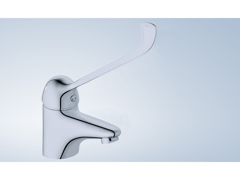 Monomando de lavabo con maneta gerontológica. Enlaces de alimentación flexibles de 3/8". Combinable con lavabo Blue de movilidad reducida.